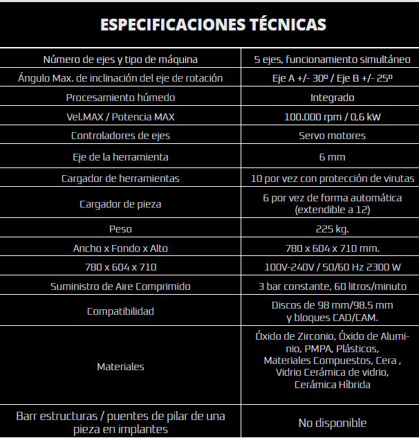 Con la evolución de la tecnología, las fresadoras en el sistema CAD/CAM han sido diseñadas con la finalidad de elaborar una vasta gama de restauraciones, prótesis, entre otras, suprimiendo la necesidad que los laboratorios dentales elaboren cofias o prótesis dentales de forma manual. Este tipo de maquinarias se caracterizan porque recortan material asistido por computadora, poseen ángulos libres con 5 ejes de 30 grados o más, permitiendo el fresado y la rectificación de las prótesis dando la forma correcta, sin embargo, pueden ser realizadas en húmedo y seco en alta calidad.12,13