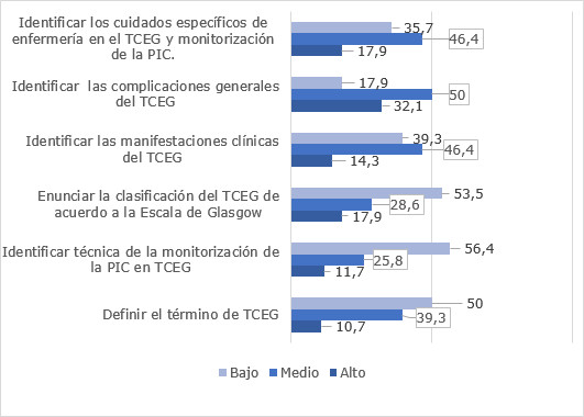 En el gráfico se muestran los niveles de conocimiento según temáticas relacionadas con el TCEG y la medición de la PIC. El nivel Alto se comportó en un menor porciento, representado en un 10,7 %. En la temática “definir el término de TCEG”, el 50 % de los enfermeros encuestados tenía conocimientos sobre identificar las complicaciones generales del TCEG, para un nivel Medio. En el nivel Bajo se comportó con 56,4 % la temática “identificar la técnica de la monitorización intracraneal en el TCEG”.