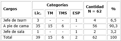 En cuanto a las categorías y cargos según formación profesional del personal, se pudo constatar que la mayoría posee la calificación de licenciado; sin embargo, el número más elevado de profesionales laboran a pie de cama (90,3 %).