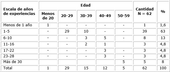 En relación a los años de experiencias y la edad, constituye una necesidad mantener la superación continua en la UCI. En la tabla 2 se evidencia el predominio de la edad 20-29 años con el 63 %; esto constituye una fortaleza en la formación y desarrollo de grados científicos profesionales.