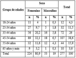 El grupo de edades más frecuente fue el comprendido entre los 45-54 años (38,6 %), predominó el sexo femenino (80,9 %) sobre el masculino (tabla 1).