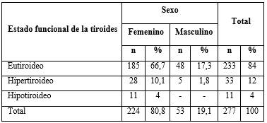 Predominó en ambos sexos el estado eutiroideo, presente en el 84 % de los pacientes (tabla 2).