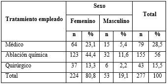 El tratamiento empleado con mayor frecuencia fue la ablación química (inyección percutánea de etanol) realizada al 56 % del total de pacientes (tabla 3).