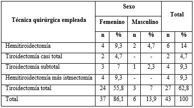 La técnica quirúrgica realizada con mayor frecuencia en quienes recibieron tratamiento quirúrgico fue la tiroidectomía total (62,8 %) (tabla 4).