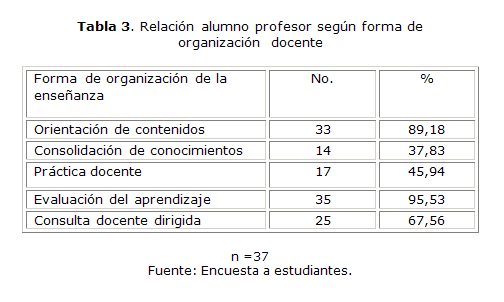 En la tabla 3 se muestra la relación de los estudiantes con los profesores en las diversas formas organizativas de la enseñanza, los estudiantes se relacionan mejor con sus profesores en la actividad de Evaluación y en la Orientación de los contenidos. Los informantes clave entrevistados refieren en su totalidad, que los profesores no están aptos para realizar la atención a las individualidades de los estudiantes que tienen en los distintos escenarios docentes, teniendo en cuenta la poca preparación pedagógica, el trabajo asistencial y el tiempo que se le dedica a la preparación de los contenidos a impartir.