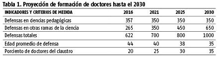 Por otro lado, para ese entonces se debe reducir de 44 a 35 años la edad promedio de defensa, a un ritmo aproximado anual de menos de un año en la edad. El incremento del número de defensas de doctorado, la mayor retención de doctores y la captación de doctores externos deben permitir avanzar de un 20 % actual de doctores en el claustro de profesores e investigadores hasta un 35 %, a un ritmo de crecimiento de un punto porcentual anualmente, sin considerar las categorías transitorias de instructor y aspirante a investigador.