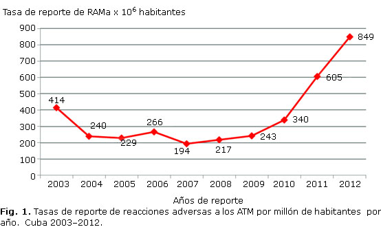 El reporte estable de reacciones adversas a los ATM en Cuba, desde el 2003 hasta el 2010, obedeció a la sostenibilidad de la notificación espontanea en ese periodo.14 La unidad nacional coordinadora de farmacovigilancia (Uncfv) comenzó a prestar mayor interés a las reacciones de baja frecuencia de aparición (ocasionales, raras y no descritas) y las severas (moderadas, graves y mortales), consideradas de interés por el Centro internacional de monitoreo de Uppsala.15