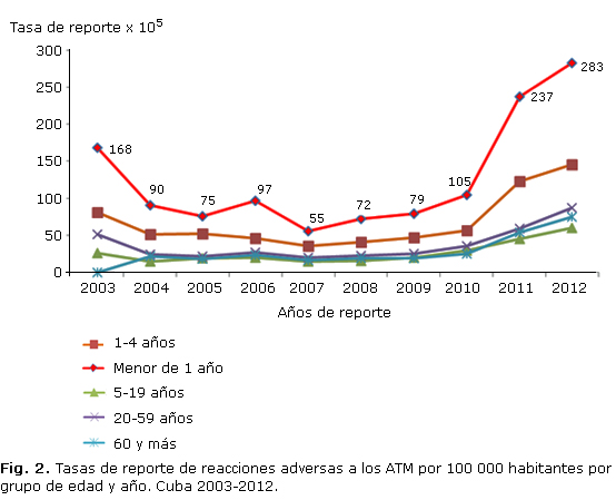 La mayor tasa de reporte en niños menores de un año, responde al hecho de que los niños constituyen una población de riesgo para la aparición de reacciones adversas. La vigilancia que se tiene sobre esta (en especial sobre los neonatos y lactantes) por parte del programa materno infantil (PAMI) del Minsap, el mayor número de consultas ambulatoria,24 las mayores tasas de atenciones médicas por infecciones respiratorias agudas (IRA) sobre todo en el último quinquenio y de enfermedades diarreicas agudas (EDA), justifican estos resultados.24
