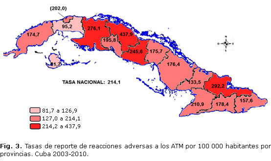 La tasa nacional de reporte de reacciones adversas a los ATM para el periodo 2003-2010 fue de 214,1 por 105 habitantes. Las provincias con mayores tasas fueron: Villa Clara (437,9), Holguín (292,2), Matanzas (276,1) y Sancti Spíritus (245,6) (Fig. 3).