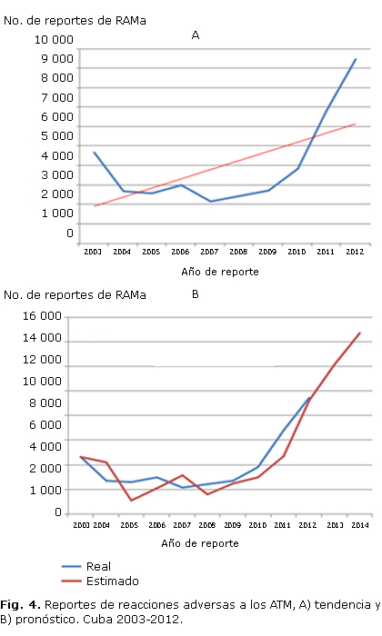 La tendencia del número de reportes de reacciones adversas a los ATM se mostró ascendente (Fig. 4A), los reportes aumentaron el 51 % con respecto a los años extremos de la serie. A partir del 2010 se produjo un ascenso comparado con años anteriores, el último año de estudio cerró con un valor 2,5 veces mayor al registrado en este año. El modelo de pronóstico (Fig. 4B) mostró que los reportes tenderán a continuar ascendiendo; el valor esperado para los años 2013 y 2014 fue de 12 099 (IC: 9 929; 14 269) y 14 719 (IC: 12 549; 16 889) reportes respectivamente.