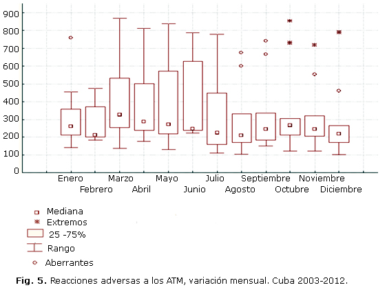 Recapitulando, tenemos que las reacciones adversas a los ATM en Cuba, muestran un incremento notable en los últimos diez años, predominan en mujeres y en menores de un año y afectan fundamentalmente la piel y el sistema gastrointestinal. Según su intensidad predominaron las moderadas. Existe tendencia creciente de los reportes y la estacionalidad específica se relaciona con el incremento anual de las enfermedades respiratorias y diarreicas agudas.