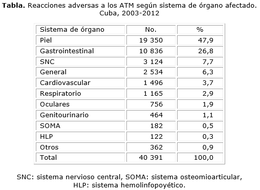Durante todo el periodo, predominaron las afectaciones de la piel (47,9 %) del tipo erupciones cutáneas, eritema, prurito. Los trastornos gastrointestinales (26,8 %) estuvieron dados principalmente por náuseas, vómitos, epigastralgia, dolor abdominal y las reacciones del sistema nervioso central (SNC) (7,7 %) estuvieron representadas por mareo, cefalea, vértigos, convulsiones entre otras (tabla).