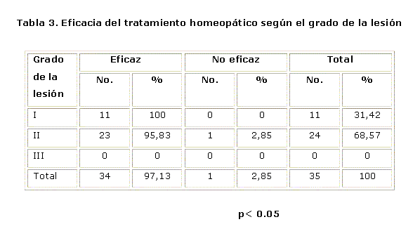 Al analizar la eficacia del tratamiento y el grado de la lesión se pudo comprobar que el 100% de los pacientes del grado I se curó y en los del grado II el 95,83% lo logró. De forma general el 97,13 de los pacientes eliminó la estomatitis subprótesis con esta terapia (Tabla 3).