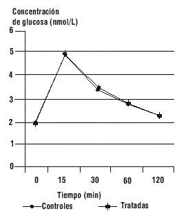 El comportamiento de la glucemia y la insulinemia durante la PTG en el grupo de ratas tratadas con testosterona se muestra en las figuras 1 y 2. Este grupo mantiene los niveles de glucosa de forma similar al grupo control (p > 0,05 para la diferencia de áreas bajo la curva), a costa de valores de insulinemia significativamente superiores al grupo control (p < 0,01 para la diferencia de áreas bajo la curva).