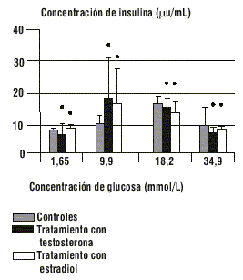 En la figura 5 se muestran los resultados del estudio in vitro de la capacidad de secreción de insulina de los islotes de Langerhans. Los islotes de las ratas tratadas con testosterona (hiperandrogenizadas) así como los de las ratas tratadas con estradiol (hiperestrogenizadas), tuvieron un comportamiento similar al de las ratas controles, para todas las concentraciones estimulatorias de glucosa utilizadas.