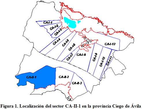 El estudio se realizó en el sector hidrogeológico CA-II-1 de la provincia de Ciego de Ávila, perteneciente a la cuenca Sur (figura 1), el cual se localiza en la parte más occidental del acuífero, con un recurso explotable de 118 hm3 y una extensión territorial de 509 km2, lo que lo sitúa como el de mayor extensión superficial de la provincia.