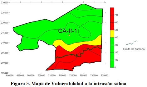Este mapa permite además determinar las zonas de eminente peligro a la contaminación por intrusión salina, teniéndose en cuenta la migración lateral y vertical del contaminante. Se observa en este caso la existencia de alta vulnerabilidad próxima a la costa para este caso de estudio.