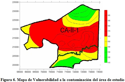 A continuación en la figura 6 se muestra el mapa logrado de la vulnerabilidad a la contaminación del área de estudio. Como se puede observar se aprecian dos pequeñas franjas indicando una baja y moderada vulnerabilidad con predominio del color verde y amarillo, al norte y al sur del acuífero.