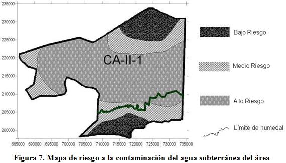 En la figura 7 se muestra el mapa de riesgo del área, donde puede observarse que en la zona central existe una extensa área de alto riesgo a la contaminación del agua subterránea, la cual coincide precisamente con la misma zona de alta vulnerabilidad, donde se encuentran ubicados la mayoría de los focos de elevado potencial de contaminación que representan un eminente peligro para la calidad del agua subterránea.