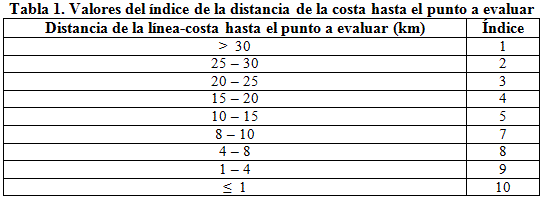 Los resultados obtenidos del índice para el parámetro de la distancia de la línea de costa hasta cada punto a evaluar, indican que los valores de mayor índice se corresponden con los puntos que se encuentran a una menor distancia de la costa y representan las zonas de mayor susceptibilidad a la contaminación por intrusión salina, lo que concuerda con estudios realizados por Paredes y Vargas (2010) en un acuífero costero de Urabá en Colombia.