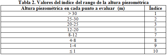 En relación con el parámetro de la altura piezométrica de cada uno de los puntos del área estudiada, los índices calculados por el método empleado oscilan entre 7 y 9 e indican que en el acuífero predominan zonas vulnerables al avance de la intrusión salina, pues existe una menor barrera natural (altura del agua) contra el avance de la cuña de intrusión marina.