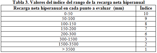Los valores de índice del parámetro de la recarga obtenido mediante la recarga neta hiperanual muestran que la mayoría de los puntajes se encuentran entre 6 y 10, lo que indica que se trata de una zona de baja recarga neta al acuífero, es decir sus valores son bajos.