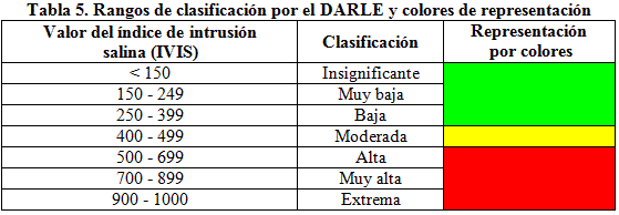 La utilización de herramientas geomáticas es de gran importancia para el estudio de la vulnerabilidad (Bocanegra et al. 2013). La confección del mapa de vulnerabilidad ante la contaminación por intrusión salina se realizó mediante los softwares Mapinfo Profesional 15.8 y el sistema Surfer 8.1. Se consideraron los valores obtenidos del índice de vulnerabilidad. En la tabla 5 se especifican los rangos formulados para la clasificación cualitativa de los valores del índice de vulnerabilidad a la intrusión salina (IVIS). La realización del mapa se basó en la interpolación de los valores del IVIS que van desde 5 hasta 105 (el índice 5 indica la mínima vulnerabilidad a la intrusión salina, mientras que el 105 la máxima), de acuerdo con las características y el comportamiento de las variables consideradas en el acrónimo DARLE, utilizando los colores indicados en dicha tabla 5.