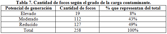 En la tabla 7 se puede observar un resumen del total de focos y la clasificación realizada según el grado de la carga contaminante y el porcentaje que representa del total de los mismos. Se comprueba que más de la mitad de los focos estudiados en el área presentan un grado de carga contaminante elevado y moderado, lo cual representa un peligro para el acuífero desde el punto de vista sanitario.