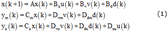 El modelo de predicción del comportamiento de la planta asume el sistema como lineal, invariante en el tiempo y está descrito por las ecuaciones (1) donde x(k) es el vector de estados nx-dimensional de la planta, u(k) es el vector nu-dimensional de las variables manipuladas (MV), v(k) es el vector nv-dimensional de las perturbaciones medibles (MD), d(k) es el vector nu-dimensional de las perturbaciones no medibles (UD), ym(k) es el vector de las salidas medibles (MO), yu(k) es el vector de las salidas no medibles (UO) y y(k) es el vector completo ny-dimensional de todas las salidas medibles (ym(k)) y no medibles (yu(k)).