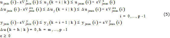 ωDui,j, ωui,j, ωyi,j, son pesos no negativos para las correspondientes variables. Mientras más pequeño sea ω, menos importancia tiene esa variable en el comportamiento del índice de performance del sistema. ujmin, ujmax, Δujmin, Δujmax, yjmin, yjmax son las barreras superior/inferior de las correspondientes variables. En la ecuación (5), las restricciones a «u», «Δu» y «y» son relajadas introduciendo la variable de relajación ε≥0. El peso ρε en la variable de relajación ε penaliza la violación de las restricciones. Mientras más grande ρε con respecto a los pesos de las entradas y las salidas, más es penalizada la violación de las restricciones. Los vectores ECR (Equal Concern for the Relaxation, en inglés) Vumin, Vumax, VΔumin, VΔumax, Vymin, Vymax tienen valores no negativos los cuales representan el interés por el relajamiento de la correspondiente restricción; mientras más grande V, más «suave» es la restricción. V=0 significa que la restricción es «dura» y que no puede ser violada. Por defecto todas las restricciones para las entradas son «duras» (Vumin=Vumax =VΔumin=VΔumax=0) y todas las restricciones para las salidas son «suaves» (Vymin=Vymax =1). Debido a que las restricciones «duras» de las salidas pueden causar que el problema de optimización no sea apropiado (por ejemplo, debido a perturbaciones no predichas, discrepancias del modelo, o simplemente debido a redondeo numérico), se produce un mensaje de alerta si Vymin, Vymax son menores que un valor pequeño dado y automáticamente se ajustan a ese valor. Por defecto se cumple (6).