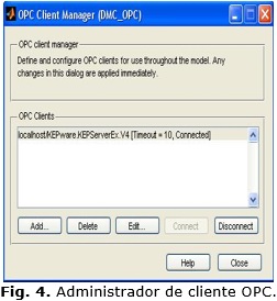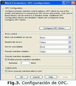 La caja de herramientas OPC de Simulink® ofrece un bloque de configuración para especificar los servidores OPC empleados en la simulación, para definir el comportamiento para errores y eventos OPC y para establecer el comportamiento en tiempo real. Durante la simulación, el modelo se ejecuta en pseudo-tiempo real, haciendo coincidir el reloj del sistema tan cerca como sea posible del tiempo de la simulación del proceso disminuyendo automáticamente la simulación. Los parámetros del bloque pueden ser también configurados de forma tal que la simulación se ejecute más lentamente que el reloj del sistema. La Fig. 3 muestra la ventana de configuración OPC y la ventana de configuración del cliente se puede observar en la Fig. 4.