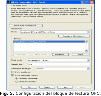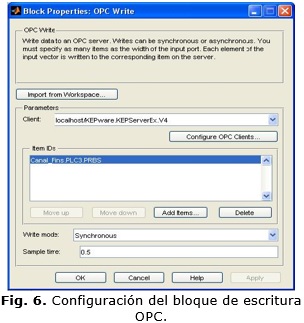 En la herramienta Simulink® de MATLAB®, los bloques contienen un administrador de clientes que hace posible especificar y administrar los servidores OPC, seleccionar elementos, y definir el tiempo de muestreo de los bloques. El bloque de lectura OPC mostrado en la Fig. 5 habilita la selección de elementos del servidor OPC y la lectura de datos en línea de la planta directamente hacia el modelo en Simulink®. El bloque de escritura OPC (Fig. 6) habilita la selección de elementos del modelo en Simulink® y permite escribir directamente datos de la planta a través del servidor OPC.