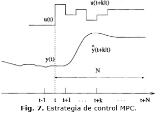 El controlador predictivo basado en modelo (MPC en inglés) 21 22 23 24 basa su funcionamiento en una estrategia llamada horizonte deslizante, donde a cada instante de tiempo son calculadas las salidas futuras del proceso ^y(t+k|k) dentro de un horizonte de predicción finito N. Para esto se emplea un modelo matemático que describe la dinámica del proceso. En una segunda etapa la señal de control futura û(t+k|k) es calculada optimizando cierto criterio en aras de mantener tanto como sea posible al proceso dentro de una trayectoria de referencia deseada, como aparece en la Fig. 7.