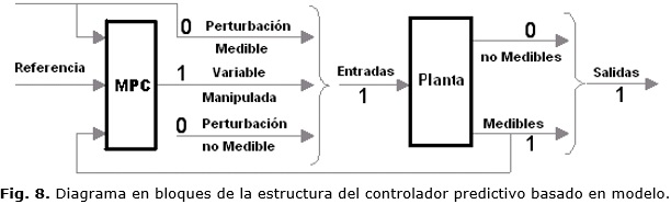 La estrategia de control MPC empleada es la desarrollada dentro de la caja de herramientas MATLAB® R2013a la cual se define como establece 25. El diagrama en bloques de la estructura del controlador MPC es la mostrada en la Fig. 8.