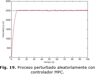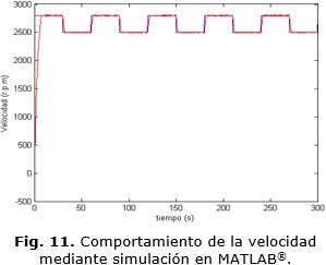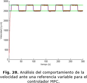 Todas las simulaciones desarrolladas tienen una duración de 300 segundos, el diagrama en bloques del esquema de simulación desarrollado en Simulink® se muestra en la Fig. 10. En la Fig. 11 se muestra el comportamiento de la velocidad ante una referencia que varía desde 2500 r.p.m hasta 2800 r.p.m empleando el bloque MPC que brinda Simulink® y el modelo del proceso.