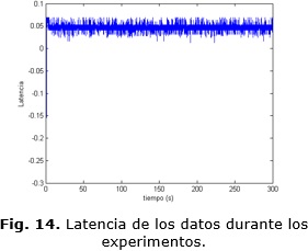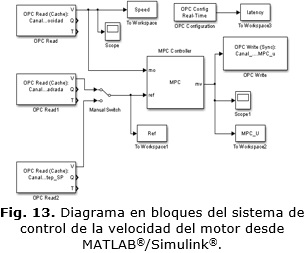 La ley de control es calculada por el controlador predictivo MPC desde MATLAB®/Simulink® (Fig. 13) y mediante la pasarela OPC esta es escrita en la salida analógica del autómata programable conectada al variador de velocidad que controla al motor. La latencia durante este experimento se aprecia en la Fig. 14. En esta figura se corrobora la condición de tiempo real durante los experimentos.