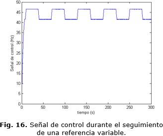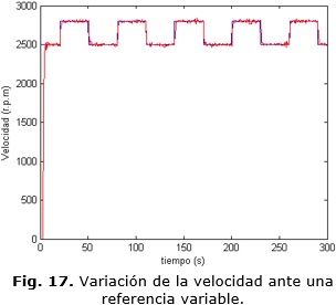 En la Fig. 15 se muestra el comportamiento de la velocidad siguiendo una referencia que varía desde 2500 r.p.m hasta 2800 r.p.m. La señal de control óptima para este caso tiene la forma que se aprecia en la Fig. 16.