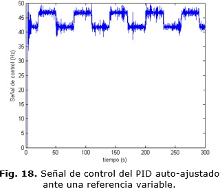 Para el caso del controlador PID, este es autoajustado en un experimento preliminar ante una señal paso escalón de amplitud 2500 r.p.m. Una vez el método de oscilaciones de ciclo límite implementado por este autómata determina y actualiza las nuevas constante P, I y D del controlador, se cambia la referencia a la mostrada en la Fig. 17. La señal de control calculada por el controlador, ante esta referencia de velocidad, para el motor de inducción con rotor tipo jaula de ardilla se muestra en la Fig. 18.