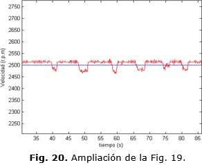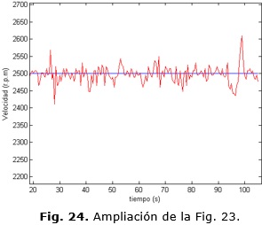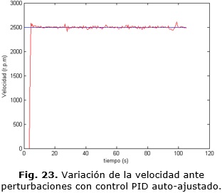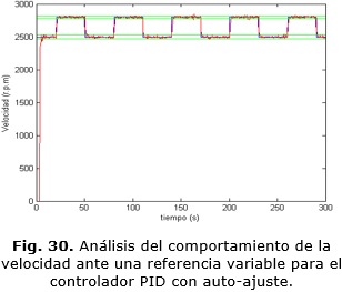 Los valores dentro de los cuales oscila la velocidad para el seguimiento de una trayectoria variable en el caso del controlador MPC no supera las +/- 20 r.p.m (Fig. 28). Para el caso del controlador PID con auto-ajuste el rango dentro del cual oscilan los valores de velocidad para una referencia fija en 2800 r.p.m no superan las +/- 23 r.p.m y para el caso de la referencia fija en 2500 r.p.m no superan las +/- 30 r.p.m como se aprecia en la Fig. 30.