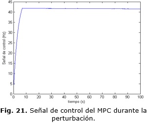Por otra parte el controlador MPC logra devolver al sistema a su estado estacionario ante la influencia de perturbaciones externas de magnitud desconocida como se puede apreciar en las Fig. 19 y Fig. 21 sin grandes esfuerzos en la señal de control, esto se debe a la estrategia de ventana deslizante que implementa este controlador, otra de sus grandes ventajas con respecto al algoritmo de control tradicional PID.