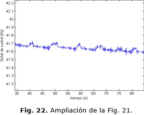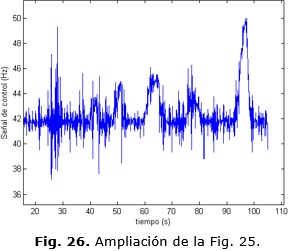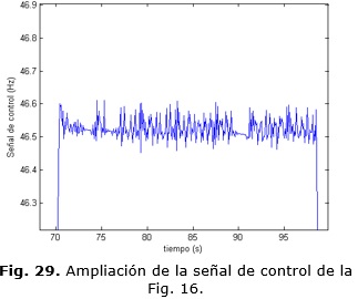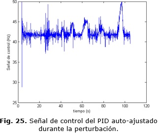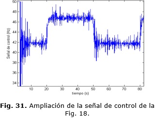 Como se aprecia en la Fig. 29 existe una variación absoluta de 0.1 Hz en la señal de control lo que equivale a 6 r.p.m aproximadamente en valor de velocidad. Evidentemente existe un error de +/- 7 r.p.m que queda fuera de discusión y que se considera error de estado estacionario. Los parámetros de la respuesta temporal para el controlador MPC y el PID con auto-ajuste se pueden apreciar en la Tabla 2.