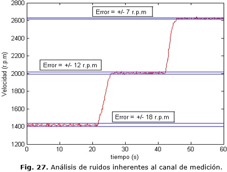 Como se puede apreciar en la Fig. 27 en los tres intervalos en los que se mantuvo constante el valor de la salida analógica (5, 7 y 9 V), la medición de la velocidad presenta un comportamiento oscilatorio dentro de una banda específica para cada caso. Estas oscilaciones tienden a disminuir a medida que la velocidad crece en valor absoluto. Sobre el intervalo de interés alrededor de las 2600 r.p.m estas oscilaciones tienen un valor de +/- 7 r.p.m aproximadamente.