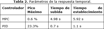 Por último, el empleo sin embargo de uno u otro algoritmo está supeditado al proceso en particular de que se trate, ya que, como se puede apreciar en la Tabla 2 el controlador MPC no presenta sobre-oscilaciones pero demora más en alcanzar el estado estacionario, sin embargo, el controlador PID responde más rápido pero a costa de una sobre-oscilación considerable.