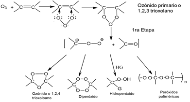 La reacción del ozono con los compuestos insaturados de los aceites vegetales se produce a través del mecanismo de ozonización de Criegee, el cual se muestra en la Figura 1 (Criegee, 1975). El resultado de la reacción es la adición 1,3 dipolar formándose el molozónido o el 1,2,3-trioxolano, que se descompone rápidamente para dar un óxido de carbonilo y aldehídos. En el caso de disolventes no participantes, el óxido de carbonilo se recombina con el compuesto carbonilo para formar los ozónidos de Criegee (1,2,4-trioxolano). Se ha comprobado que cuando tiene lugar la ozonización de una emulsión acuosa de ácido oleico se produce predominantemente peróxido de hidrógeno, hidroxi-hidroperóxido y aldehídos (Ledea et al., 2019).