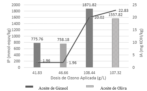 Al finalizar las ozonizaciones, se obtuvieron para la misma dosis de ozono aplicada, valores de índice de peróxidos de 1557,82 mmoleq/kg para el aceite de oliva y de 1871,82 mmoleq/kg para el aceite de girasol. Los índices de acidez tuvieron ligeras diferencias resultando 20,02 y 22,83 mg KOH/kg respectivamente, se observa el comportamiento de estos parámetros en la Figura 1. En el caso de la viscosidad se obtuvo para el aceite de girasol ozonizado un valor de 0.80 Pa.s y para el aceite de oliva 0.77 Pa.s.