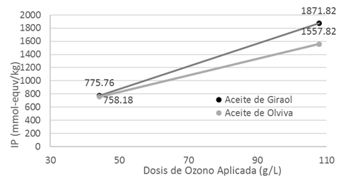 Los aceites ozonizados con IP entre 700 y 800 mostraron valores similares en el IP final además de tener el mismo valor de acidez, lo que implica que a dosis de ozono aplicadas similares se obtienen aceites ozonizados con caracteristicas fisco-químicas también similares, menos en el caso de la viscosidad en que el aceite de girasol, aceite con mayor cantidad de insaturaciones, alcanzó un valor de viscosidad mayor que el aceite de oliva, lo que induce a pensar que en este aceite los poliperóxidos están en mayor concentración y son los que más tributan al valor del IP alcanzado.