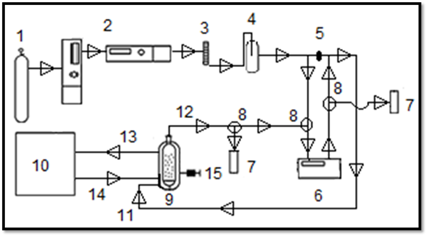La instalación a escala de laboratorio (Anexo 1) consistió en una columna de burbujeo de vidrio enchaquetado de 100 mL de capacidad, que posee un difusor de vidrio poroso. El régimen de trabajo de la columna es semi-continuo. La misma se acopló a un termostato Frigomix U-2, para controlar la temperatura de la reacción a 20 ±2 oC. La mezcla oxígeno-ozono se obtuvo en un ozonizador modelo AQOZO-LAB (Cuba), a partir de oxígeno embotellado en cilindros de 6m3 de volumen, con un nivel de pureza del 95%. Se utilizó además una trampa de agua antes de la entrada del gas al reactor, para eliminar los óxidos de nitrógeno formados por las impurezas de nitrógeno que pudiera traer el oxígeno. Para realizar las mediciones de las concentraciones de entrada y de salida a la columna se empleó un medidor de ozono marca Anseros modelo OZOMAT (Alemania).