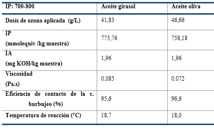 Ozonización de aceite de girasol y aceite de oliva con IP entre 700-800.