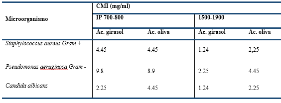 Los resultados obtenidos muestran un aumento de la actividad antimicrobiana a medida que aumenta el índice de peróxido (tabla 4). En el caso de los aceites ozonizados entre 700-800 mmol-equiv/kg, tanto oliva como girasol, no mostraron diferencias significativas en los valores de CMI de las bacterias evaluadas bajo las condiciones experimentales seleccionadas, en el caso de la levadura se obtuvo un valor menor CMI en el caso del aceite de girasol. En un estudio anterior otros autores llegaron al mismo resultado evaluando Candida tropicalis (Contreras et al., 1989). El análisis de los resultados para los aceites ozonizados a alto índice de peróxido mostró que los mejores resultados, para todos los microrganismos, fueron obtenidos con el aceite de girasol.